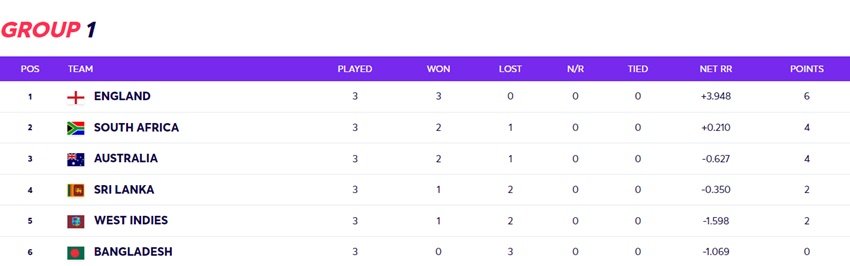 सुपर 12 में ग्रुप 1 में इंग्लैंड का नेट रनरेट (+3.948) लगभग चार का है। दूसरे नंबर पर साउथ अफ्रीका है। उसका नेट रनरेट +0.210 का है। ऑस्ट्रेलिया तीसरे नंबर पर है। उसका नेट रनरेट -0.627 है। साउथ अफ्रीका और ऑस्ट्रेलिया दोनों के 4-4 अंक हैं। साउथ अफ्रीका को अब बांग्लादेश और इंग्लैंड से भिड़ना है। वहीं ऑस्ट्रेलिया की बांग्लादेश और वेस्टइंडीज से भिड़ंत होनी है।