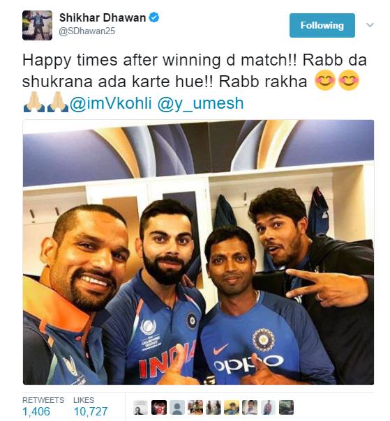चैम्पियंस ट्रॉफी में बेहद कठिन माने जा रहे मुकाबले में भारत ने द.अफ्रीका को बेहद आसानी से मात दे दी। भारत अब सेमीफाइनल में बांग्लादेश से भिड़ेगा। मैच से पहले भारत-द.अफ्रीका का मुकाबला कांटे का माना जा रहा था, क्योंकि मौजूदा दौर में द.अफ्रीका वनडे की नंबर एक टीम है। 8 विकेट से जीत हासिल करने के बाद टीम इंडिया ने ड्रेसिंग रूम में जमकर जश्न मनाया। मैच में शानदार अर्धशतक लगान वाले ओपनर शिखर धवन ने अपने आधिकारिक ट्विटर हैंडल से एक तस्वीर पोस्ट की है। इस तस्वीर में शिखर धवन, कप्तान विराट कोहली और उमेश यादव नजर आ रहे हैं। फोटो के कैप्शन में धवन ने लिखा, मैच जीतने के बाद खुशी के पल। रब दा शुकराना अदा करते हुए। रब राखा।