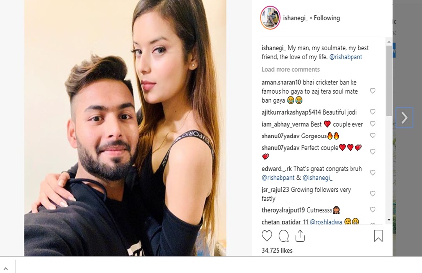 पंत सोशल मीडिया पर काफी एक्टिव रहते हैं, उन्होंने अपने इंस्टाग्राम पर एक लड़की की तस्वीर साझा करते हुए लिखा कि मैं बस तुम्हें खुश रखना चाहता हूं क्योंकि तुम्हारी वजह से मैं बहुत खुश हूं। बता दें कि इस लड़की का नाम ईशा नेगी है और खबरों की मानें तो ये इंटीरियर डेकोर डिजाइनर भी हैं। मामला यहीं नहीं रुका इसके बाद इस पंत के इस इजहार-ए- मोहब्बत का जवाब देते हुए ईशा ने लिखा कि तुम मेरी जिंदगी हो, मेरे सबसे अच्छे दोस्त और मेरा प्यार भी हो।