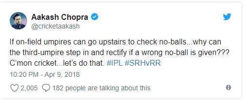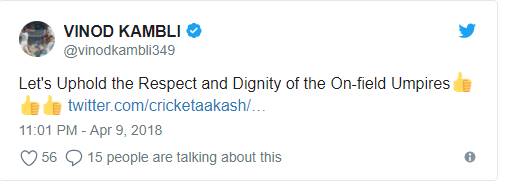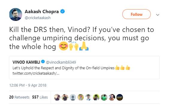 आकाश चोपड़ा ने गलत नोबॉल की समीक्षा का मुद्दा उठाते हुए ट्वीट करते हुए कहा-अगर फील्ड अंपायर नो बॉल का पता लगाने के लिए ऊपर जा सकते हैं तो फिर थर्ड अंपायर गलत तरह से नो बॉल दिए जाने पर गलती सुधार क्यों नहीं सकते?। आकाश चोपड़ा के इस ट्वीट पर तंज कसते हुए पूर्व क्रिकेटर विनोद कांबली ने लिखा-चलो फील्ड अंपायर्स के लिए रेस्पेक्ट तो बढ़ा। बहस यही नहीं खत्म हुई बल्कि आकाश चोपड़ा ने एक और ट्वीट कर विनोद कांबली को जवाब दिया।