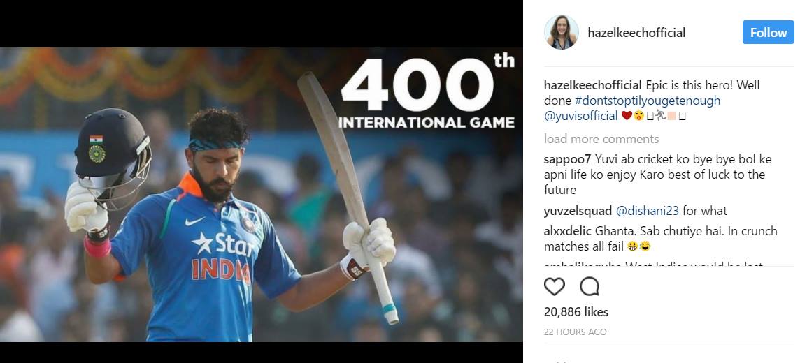 हिटमैन युवराज सिंह की काबिलियत पर शायद ही किसी को शक हो। जब युवी फॉर्म में हों, तो किसी भी गेंदबाजी की बखिया उधेड़ सकते हैं। हाल ही में 300वां वनडे मैच खेलने वाले युवराज ने एक और मुकाम अपने नाम कर लिया है। युवराज सिंह 400 अंतरराष्ट्रीय मैच खेलने वाले खिलाड़ी बन गए हैं। शुक्रवार को वेस्टइंडीज के खिलाफ पोर्ट अॉफ स्पेन में खेले गए मैच में युवराज ने यह कीर्तिमान अपने नाम किया। क्वीन्स पार्क में खेला गया यह वनडे मैच बारिश के कारण रद्द हो गया था। इस खास मौके पर युवराज की पत्नी हेजल कीच ने उन्हें शानदार अंदाज में मुबारकबाद दी है। बॉलिवुड एक्ट्रेस हेजल ने इंस्टाग्राम पर एक तस्वीर पोस्ट की है। इसके कैप्शन में उन्होंने लिखा, महाकाव्य तो यह हीरो है। बहुत खूब।