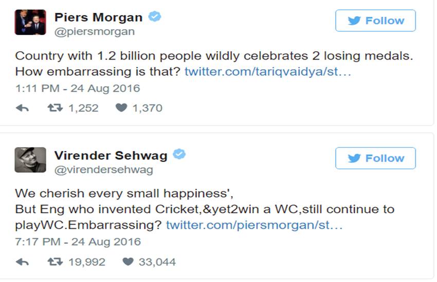 जब उनसे पूछा गया कि उनका सबसे मजेदार ट्रोल कौन सा था तो उन्होंने कहा कि उन्हें ब्रिटिश जर्नलिस्ट पियर्स मोर्गन को ट्रोल करने में मजा आया था, क्योंकि वह भारत के खिलाफ कुछ नहीं सुन सकते। बता दें कि मोर्गन ने कहा था कि 1.2 बिलियन की आबादी वाले देश भारत के लिए सिर्फ दो ओलिंपिक मेडल लाना शर्मनाक है। सहवाग ने मोर्गन को करारा जवाब देते हुए कहा कि जिन इंग्लैंड ने क्रिकेट को जन्म दिया, उसने कभी विश्व कप तक नहीं जीता, यह भी शर्मनाक है।