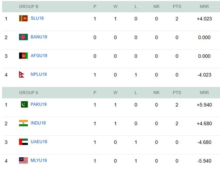 भारत ने यूएई को 234 रन से हराते हुए 2 अंक अर्जित किए थे जबकि पाकिस्तान ने मलेशिया को 297 रन से हराकर अपना खाता खोला था। भारत ने बेशक जीत दर्ज की, लेकिन बेहतरीन रन रेट के आधार पर पाकिस्तान की टीम ग्रुप ए की अंकतालिका में पहले स्थान पर आ गई। पाकिस्तान का नेट रन रेट इस जीत के बाद +5.940 का रहा जबकि भारत का नेट रन रेट +4.680 का रहा। वहीं ग्रुप बी की अंकतालिका में यूएई तीसरे और मलेशिया चौथे नंबर पर है।