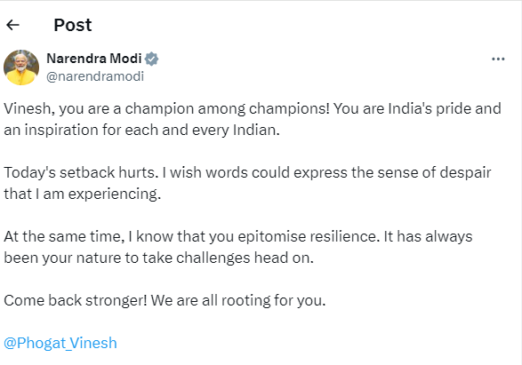 देश के प्रधानमंत्री नरेंद्र मोदी ने विनेश फोगाट के लिए ट्वीट करके उनका हौसला बढ़ाया और कहा कि आप चैंपियन हैं।