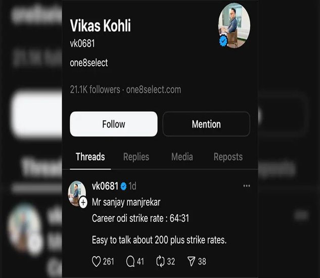 विकास कोहली ने सोशल मीडिया प्लेटफॉर्म थ्रेड्स पर लिखा, मिस्टर संजय मांजरेकर, वनडे करियर स्ट्राइक रेट…64.31, 200 प्लस स्ट्राइक रेट की बात करना आसान है। आपको बता दें कि कुछ दिन पहले मांजरेकर ने कहा था कि कोहली अब अपने चरम पर नहीं हैं। उन्हें बेस्ट बनाम बेस्ट में शामिल नहीं कर सकते हैं। इसके अलावा उन्होंने एक एक पोस्ट में टॉप 10 बल्लेबाजों की लिस्ट से भी कोहली को बाहर रखा था जबकि कोहली इस सीजन में सबसे ज्यादा रन बनाने वाले टॉप 5 बल्लेबाजों में दूसरे नंबर पर (खबर लिखे जाने तक) हैं।