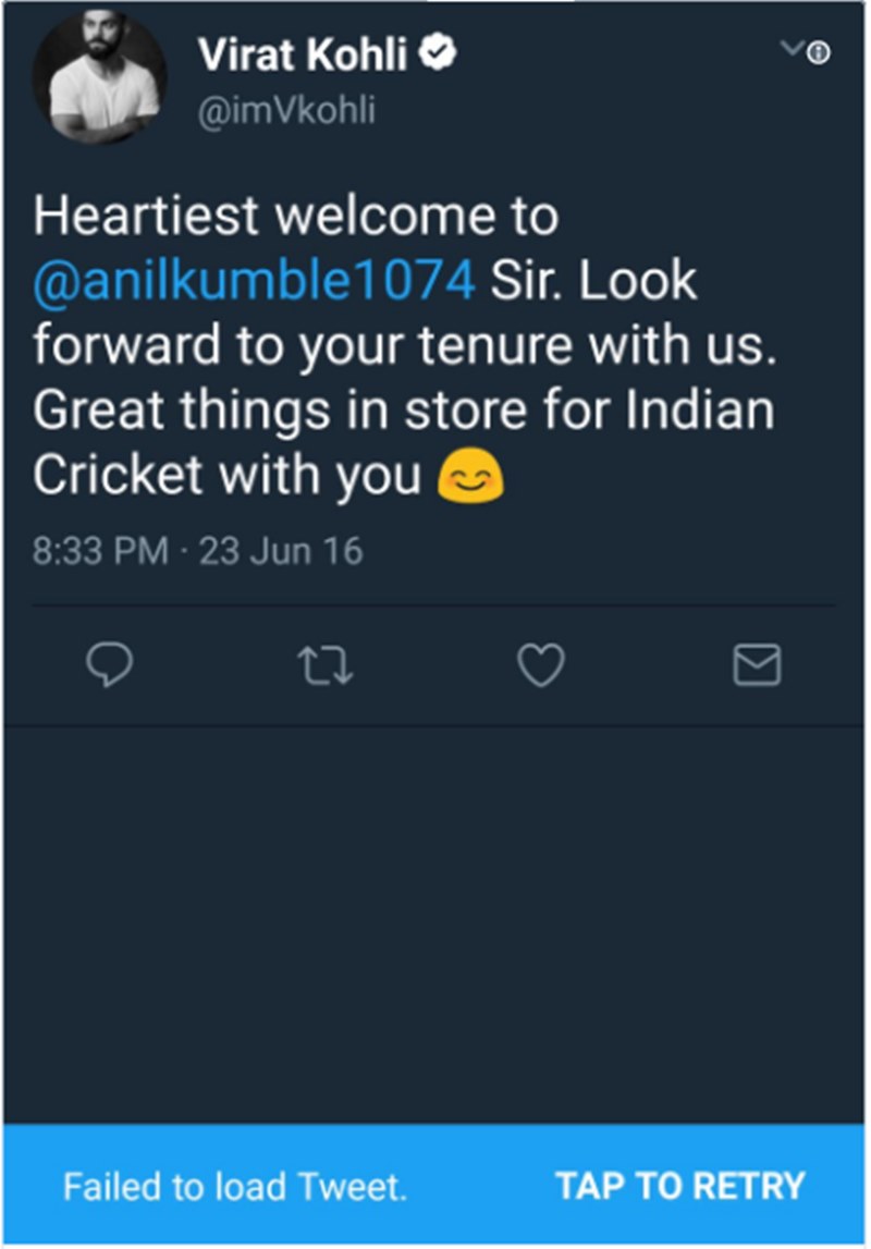 कुंबले के इस्तीफा देने के बाद कोहली ने उनके वेलकम ट्वीट को डिलीट कर दिया। हालांकि, इस ट्वीट के बदले जवाब में कुंबले का ट्वीट अभी भी सोशल मीडिया पर मौजूद है। इस मशहूर लेग स्पिनर ने अपने जवाब में कोहली को लिखा था, “धन्यवाद विराट कोहली। आपके साथ और टीम इंडिया के साथ काम करने को लेकर मैं भी उत्साहित हूं।”