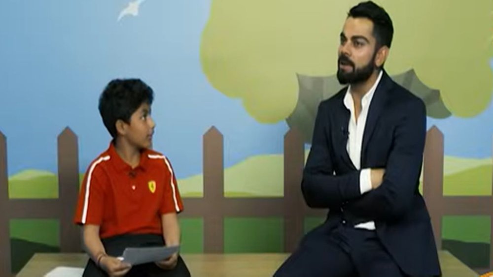 इस वक्त टीम इंडिया से ब्रेक पर चल रहे विराट कोहली का एक पुराना इंटरव्यू सोशल मीडिया पर वायरल हुआ। यह इंटरव्यू उन्होंने पूर्व भारतीय ओपनर वीरेंद्र सहवाग के बेटे को कुछ साल पहले दिया है। स्टार स्पोर्ट्स पर सहवाग के बेटे ने कोहली का बड़ा ही मजेदार इंटरव्यू लिया था। इस कैंडिड इंटरव्यू में आर्यवीर सहवाग ने कोहली से बहुत ही रोचक सवाल पूछे जिनका विराट ने बहुत ही सहजता के साथ जवाब दिया। इसी बातचीत के दौरान कोहली एक सवाल के जवाब में थोड़ा फंस गए और उन्होंने जवाब भी गलत दे दिया।