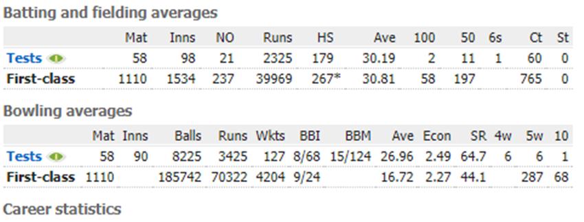वहीं बात अगर गेंदबाजी की करें तो इस क्रिकेटर ने 2.27 की इकॉनमी के साथ 4204 शिकार भी किए। रोड्स ने इस दौरान पारी में 287 बार 5 विकेट और मैच में 68 बार 10 या उससे ज्यादा विकेट लिए। इसके साथ ही विलफ्रेड रोड्स ने 58 टेस्ट मैच भी खेले, जिसमें उन्होंने 2325 रन बनाने के साथ 127 शिकार किए। रोड्स ने 1899 से 1930 तक टेस्ट मैचों में 1 से लेकर 11 नंबर तक सभी पोजिशन पर बल्लेबाजी की है।