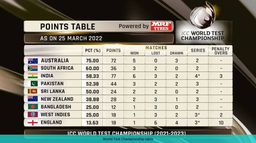 ऑस्ट्रेलिया और पाकिस्तान की टेस्ट सीरीज खत्म होने के बाद पैट कमिंस की अगुआई वाली ऑस्ट्रेलियाई टीम के 72 अंक हो गए हैं। वह 75 पर्सेंटाइल के साथ शीर्ष पर है। साउथ अफ्रीका के 36 अंक हैं। उसका पर्सेंटाइल 60 है, इसलिए वह भारत से कम अंक होने के बावजूद दूसरे नंबर पर है। भारत के 77 अंक हैं और उसका पर्सेंटाइल 58.33 है। पाकिस्तान के 44 अंक हैं, जबकि उसका पर्सेंटाइल 52.38 है।