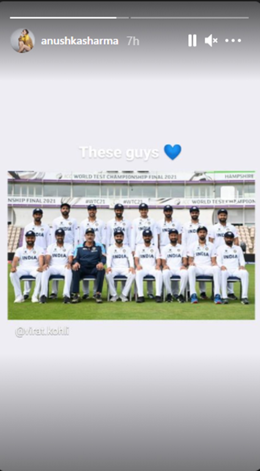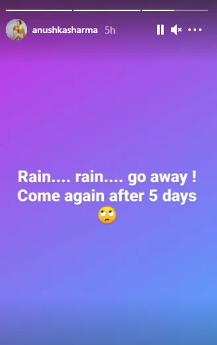 अनुष्का शर्मा ने अपनी इंस्टाग्राम स्टोरी (Instagram Story) में कविता के जरिए एक संदेश साझा किया। इसमें उन्होंने लिखा, ‘रेन, रेन गो अवे! कम अगेन ऑफ्टर 5 डेज (बारिश तुम अभी चली जाओ और पांच दिन बाद आना)।’ अनुष्का ने बारिश को 5 दिन बाद आने का न्योता इसलिए दिया, क्योंकि टेस्ट मैच 5 दिन बाद समाप्त हो जाएगा। अनुष्का ने इसके अलावा इंस्टाग्राम स्टोरी में भारतीय टीम की ग्रुप फोटो भी शेयर की है। इस तस्वीर में टीम के खिलाड़ियों के साथ हेड कोच रवि शास्त्री भी हैं।