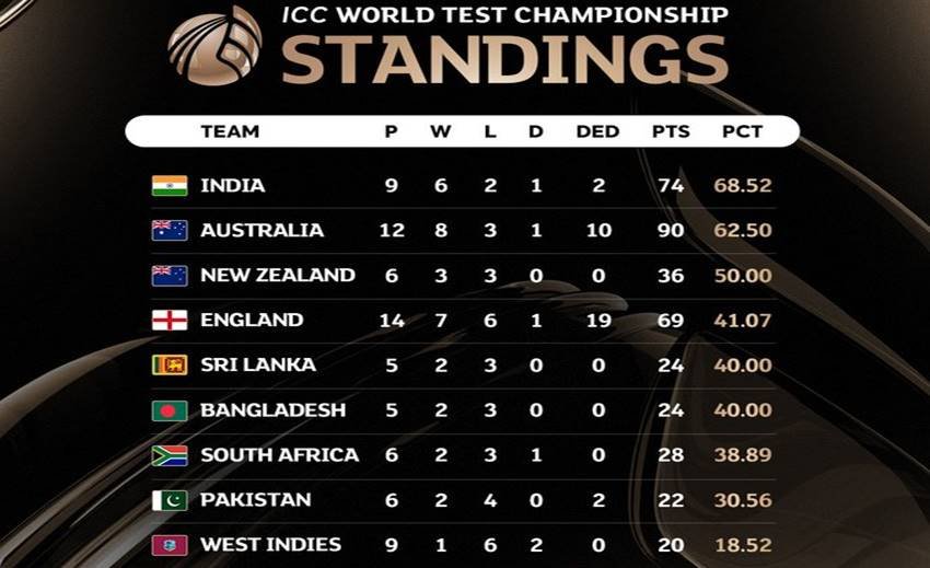 वर्ल्ड टेस्ट चैंपियनशिप की अंकतालिका मे्ं फिलहाल भारत नंबर एक पर बना हुआ है। भारत ने 9 में से 6 मैच जीते हैं 2 हारे हैं और एक मैच ड्रॉ रहा है। भारत की जीत का प्रतिशत फिलहाल 68.52 है। वहीं दूसरे नंबर पर 62.50 की जीत फीसदी के साथ ऑस्ट्रेलिया दूसरे जबकि 50.00 की जीत प्रतिशत के साथ न्यूजीलैंड तीसरे नंबर पर है। इस अंकतालिका में इस वक्त इंग्लैंड की टीम 41.07 जीत प्रतिशत के साथ चौथे नंबर पर हैं। पांचवें स्थान पर श्रीलंका 40.00 जीत प्रतिशत के साथ है जबकि सातवें नंबर पर मौजूद साउथ अफ्रीका की जीत का प्रतिशत 38.89 है। 9वें नंबर पर अभी वेस्टइंडीज है जिसकी जीत का प्रतिशत 18.52 है।