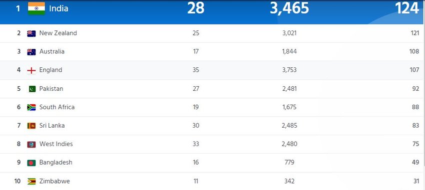 इस जीत के साथ भारत के 124 रेटिंग पॉइंट हो गए हैं। वहीं दूसरे स्थान पर खिसकी कीवी टीम के 121 अंक हैं। इस लिस्ट में तीसरे स्थान पर ऑस्ट्रेलिया (108), चौथे पर इंग्लैंड (107) और पांचवे पर पाकिस्तान (92) अंकों के साथ काबिज है। वहीं जिम्बाब्वे टॉप-10 टीमें में आखिरी स्थान पर है।