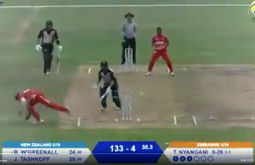 न्यूजीलैंड के बेकहम व्हीलर-ग्रीनॉल (Beckham Wheeler-Greenall) बल्लेबाजी कर रहे थे। बाएं हाथ के स्पिनर ताडीवानाशे न्यांगानी (Tadiwanashe Nyangani) ने उन्हें गेंद फेंकी। यह गेंद ग्रीनॉल के लेग साइड की ओर जा रही थी। ग्रीनॉल ने इसे आगे बढ़कर मारने की कोशिश की, लेकिन वे चूक गए। चूंकि लेग साइड की ओर जा रही थी, इसलिए विकेट के पीछे खड़े डेन शैडेनडोर्फ को पकड़ने के लिए अपने बाईं ओर भागना पड़ा। हालांकि, जब उन्होंने देखा कि ग्रीनॉल क्रीज से बहुत बाहर हैं तो उन्होंने बिना पलटे वहीं गेंद को पकड़ा और स्टम्प की ओर फेंका। शैडेनडोर्फ का थ्रो इतना सटीक था कि ग्रीनॉल के वापस क्रीज पर पहुंचने से पहले गेंद उनकी गिल्लियां बिखेर चुकी थी।