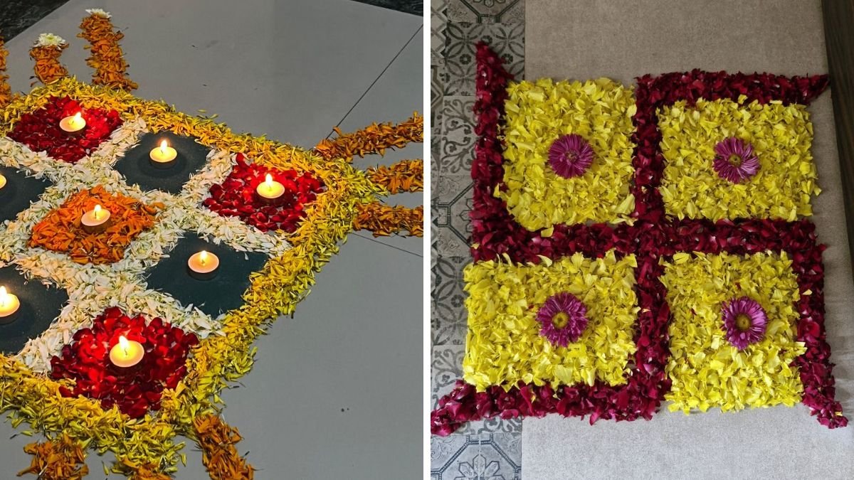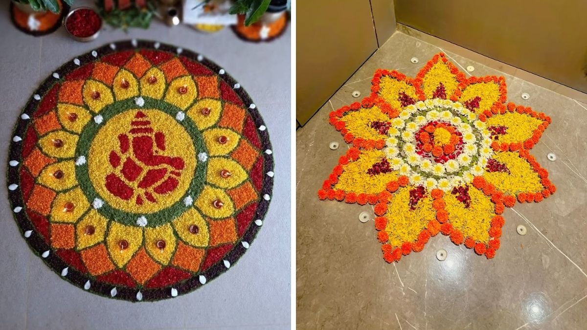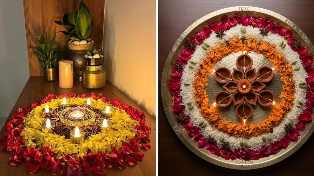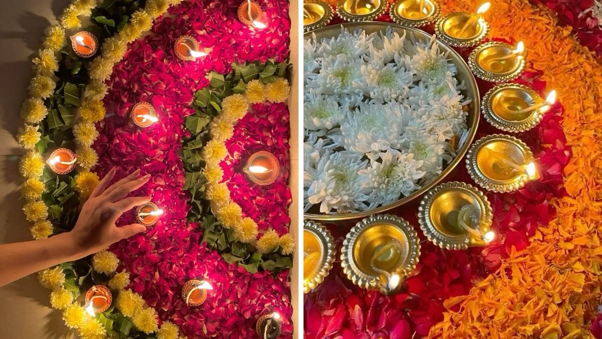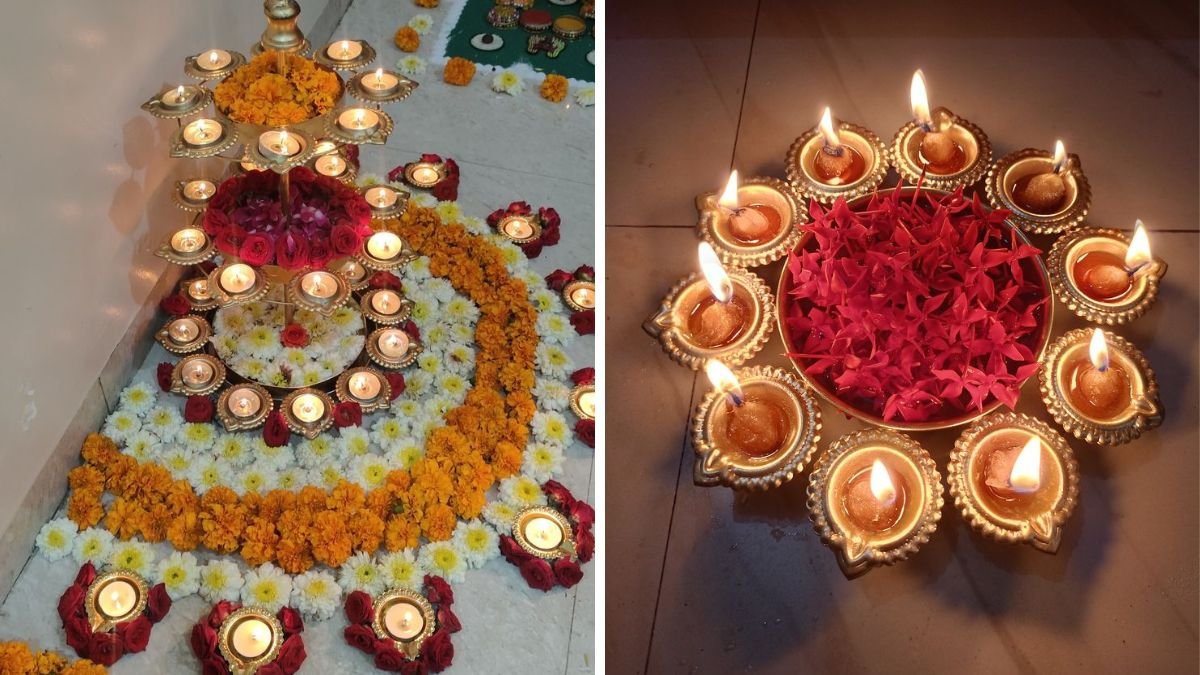 अगर आप भी इन त्योहारों में अपने घर को खास अंदाज में सजाना चाहते हैं, तो फूल और दीयों से रंगोली बना सकते हैं। आज के समय में यह काफी ट्रेंड में है। इसे बनाने से आपको मॉडर्न टच भी मिलेगा। इस रंगोली से आपका घर त्योहारों के रंगों से खिल उठेगा।