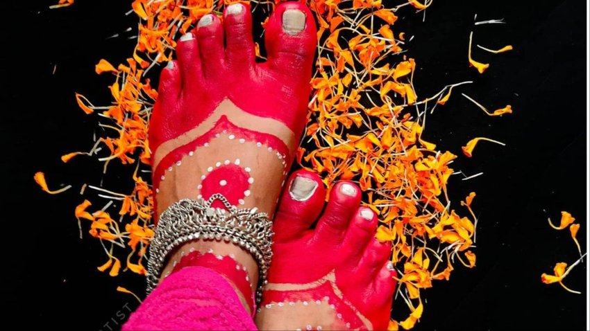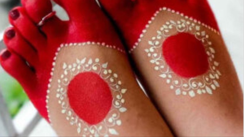 करवा चौथ पर आप फूलों वाली आलता डिजाइन लगा सकती हैं। ये आपके पूरे पैर को मेहंदी की तरह सजा देती है। तो आपको करना ये है कि पैरों में पहले डिजाइन सोच लें और फिर पहले पेंट ब्रश की मदद से डिजाइन लगाएं और फिर इसके कोने कोने में सफेद रंग के कुमकुम से डिजाइन बनाकर कंप्लीट करें।
