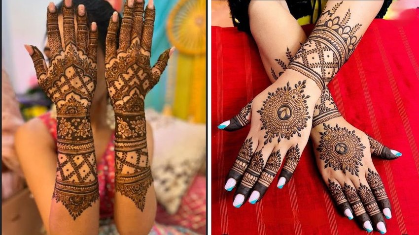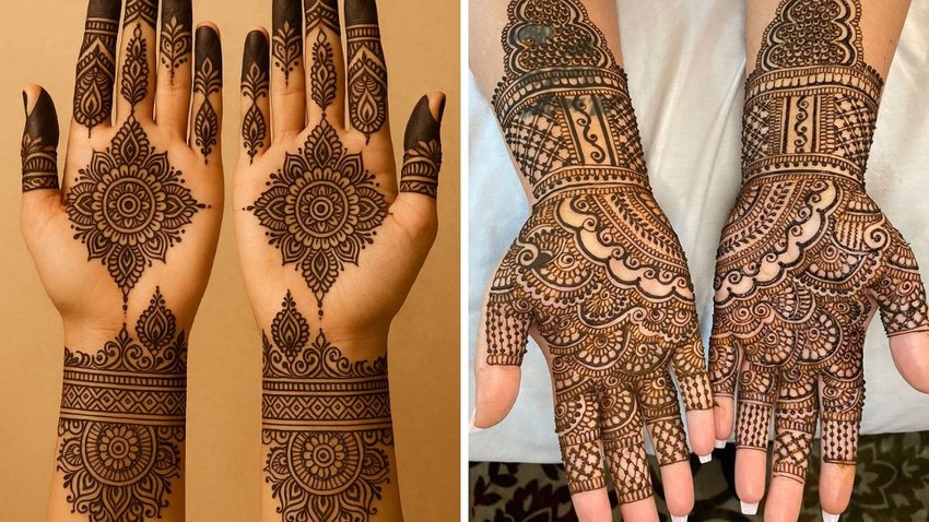 सावन के पावन महीने के लिए यह मेहंदी डिजाइन आपके लिए काफी परफेक्ट है। इन दोनों तस्वीरों में खूबसूरत और लेटेस्ट मेहंदी डिजाइन्स नजर आ रही हैं। बाईं ओर फ्लोरल और ज्योमेट्रिक पैटर्न के साथ अरेबिक टच दिया गया है। वहीं, दाईं ओर की मेहंदी में जाल, बेल-बूटे और आर्क डिजाइन की बारीक कलाकारी दिखाई गई है।