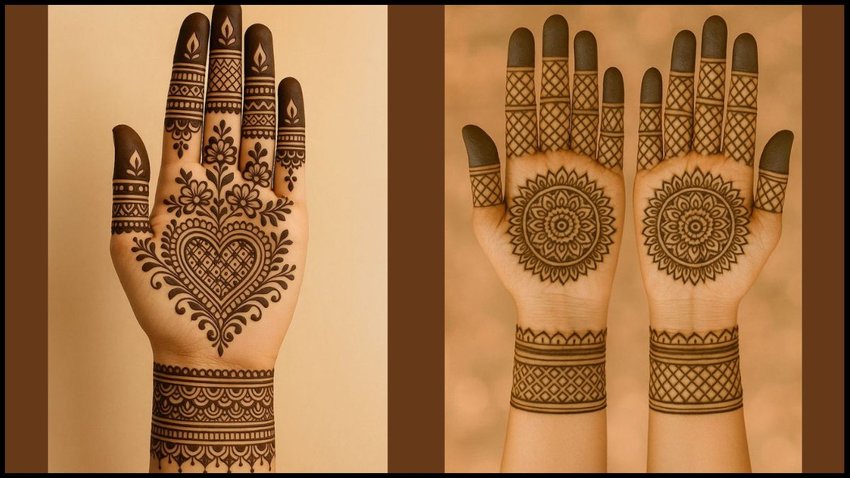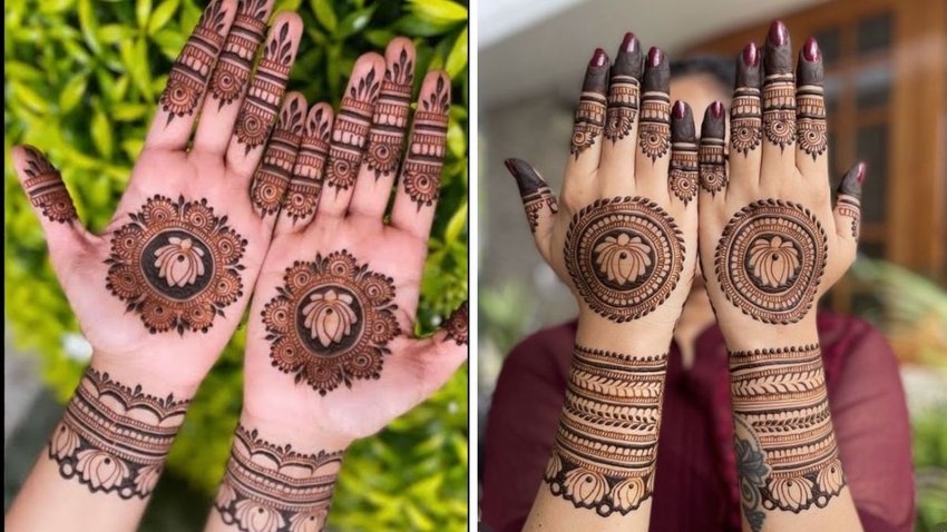 आप अपने हाथों पर मंडला स्टाइल में मेहंदी डिजाइन लगा सकती हैं। बाईं ओर दोनों हथेलियों पर मंडला स्टाइल में गोल फूल बने हैं और उंगलियों पर ज्योमेट्रिक डिजाइन है। वहीं, दाईं ओर हथेली के बीच में बड़ा फूल और नीचे एक छोटा फ्लावर मोटिफ है, जो उंगलियों तक फैला हुआ है। यह दोनों डिजाइन सावन पावन महीने के लिए काफी बेहतरीन हैं।