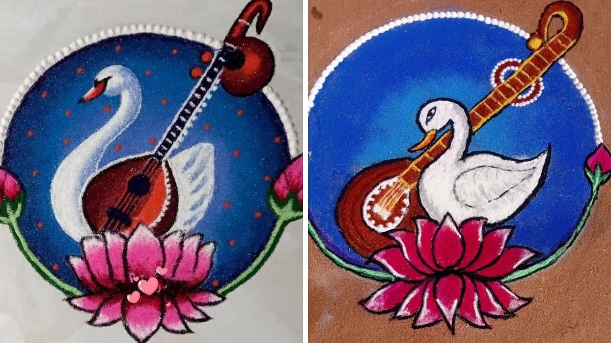 आप हंस और कमल रंगोली डिजाइन को भी आसानी से बना सकते हैं। नीले, सफेद और गुलाबी रंग इसे बेहद आकर्षक बनाते हैं। पारंपरिक लुक पसंद करने वालों के लिए यह डिजाइन बसंत पंचमी पर शानदार ऑप्शन है।