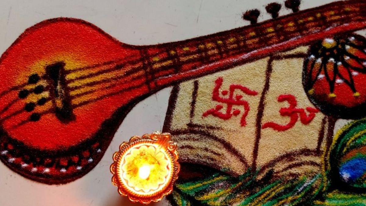सरस्वती पूजा के दिन आप वीणा और पुस्तक वाली रंगोली को आप आसानी से तैयार कर सकते हैं। यह रंगोली ज्ञान और संगीत का सुंदर प्रतीक को दर्शा रही है। इसमें मां सरस्वती की प्रिय वीणा, खुली पुस्तक, स्वस्तिक और ओम चिन्ह भी आसानी से बना सकते हैं।