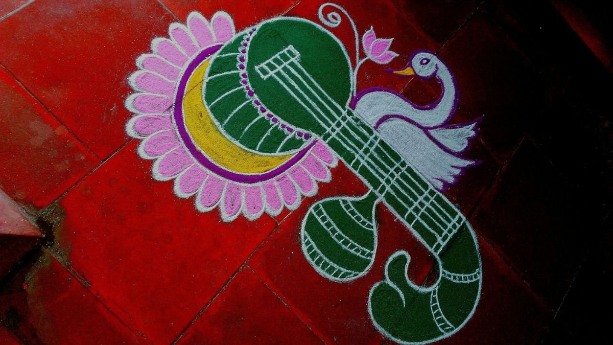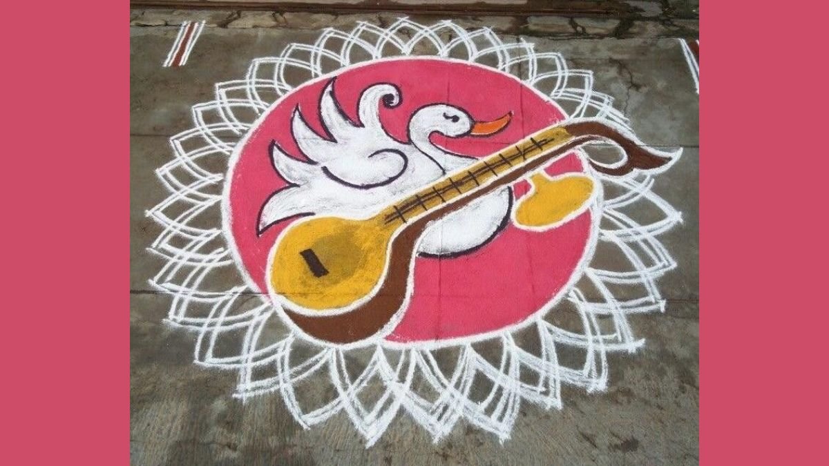 मां सरस्वती की आकृति वाली रंगोली