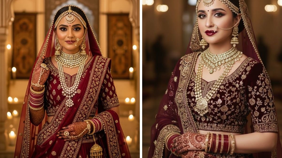 इस लहंगे को आप शादी के दिन पहन सकती हैं। इस तस्वीर में मैरून रंग का ब्राइडल लहंगा बेहद रॉयल और ग्रेसफुल नजर आ रहा है। बारीक गोल्डन एम्ब्रॉयडरी, हैवी ज्वेलरी और सॉफ्ट दुपट्टा इसे शादी के लिए परफेक्ट और ट्रेंडी लुक देता है।
