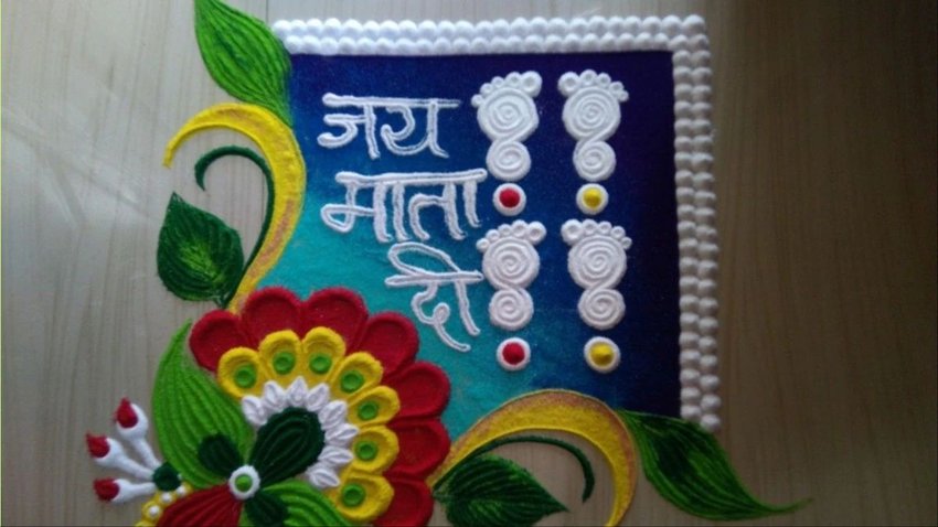 नवरात्र के तीसरे दिन आप जय माता दी लिखे रंगोली को भी बना सकते हैं। इसके साथ आप एक सुंदर फूल को भी रख सकते हैं। इसको बनाना एकदम आसान है और इसके ऊपर आप डॉट-डॉट भी रख सकते हैं।