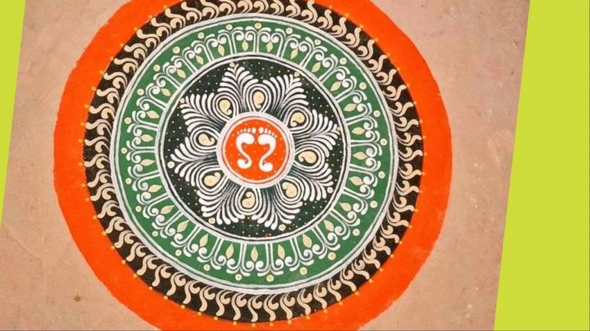 शुभ-लाभ, कलश और चरण पादुका के डिजाइन में यह रंगोली काफी परफेक्ट है। इसको आप आटे और कुछ रंगों की मदद से आसानी से तैयार कर सकते हैं। इस रंगोली के बीच में एक कलश है, जो देखने में काफी सुंदर लग रहा है।