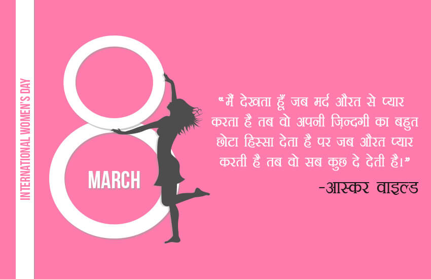 Happy International Women’s Day 2018 Quotes: 8 मार्च को इंटरनेशनल वुमेन्स डे के दिन पूरे विश्व में अनेक कार्यक्रमों का आयोजन किया जाता है। इस दिन महिलाओं के प्रेम, त्याग, आत्मविश्वास और समाज के प्रति उनके बलिदान के लिए उनके प्रति सम्मान प्रदर्शित किया जाता है। कई महिला संगठनों द्वारा अनेक कार्यक्रम आयोजित किए जाते है। सबसे पहले यह दिन अमेरिका में सोशलिस्ट पार्टी के आह्वान पर 28 फ़रवरी 1909 को मनाया गया था। बाद में इसे फरवरी के आखिरी रविवार को मनाया जाने लगा। सन 1910 में वूमेन्स ऑफिस की लीडर कालरा जेटकीन नाम की महिला ने जर्मनी में इंटरनेशनल वूमेन डे का मुद्दा उठाया। उन्होंने सुझाव दिया कि हर देश को एक दिन महिला को बढ़ावा देने के रूप में मनाना चाहिए। इस दिन का वास्तविक अर्थ यह है कि महिलाओं को जीवन में बराबरी का हक मिले। इसलिए इस दिन का पूरे विश्व में खुशी और उत्साह के साथ मनाया जाता है। महिला दिवस का वास्तविक उद्देश्य यह है कि महिलाओं को जीवन में बराबरी का हक मिले।