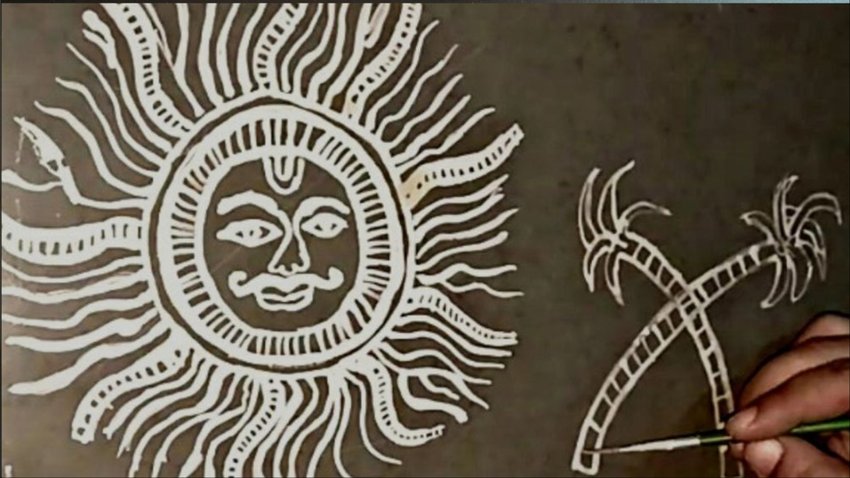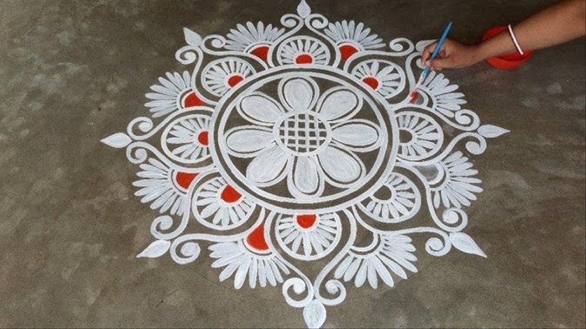 इस रंगोली को बनाने के लिए चावल को पीस लें और इसमें थोड़ा सा पानी मिला लें। फिर आप एक लकड़ी की मदद से आप इसे बना सकते हैं। आप इसमें कुमकुम और हल्दी का भी इस्तेमाल कर सकते हैं।
