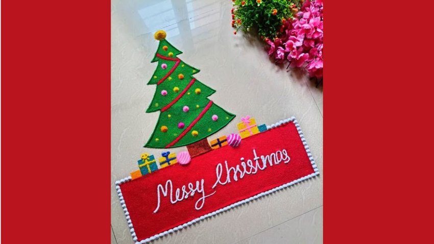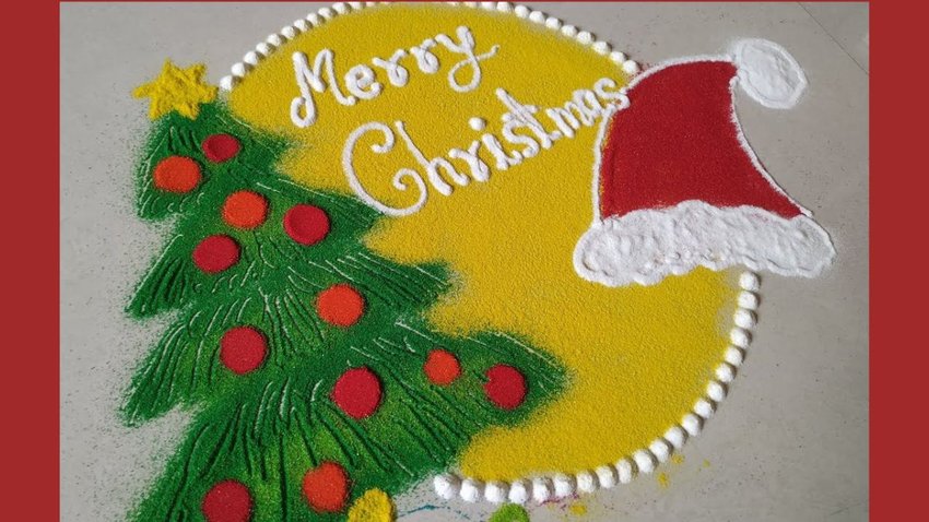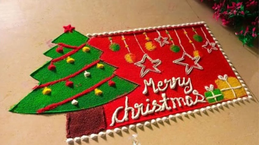 Merry Christmas के साथ बना यह रंगोली देखने में काफी शानदार और बेहतरीन लग रहा है। इसको आसानी से बनाया जा सकता है इस रंगोली में क्रिसमस ट्री भी है।