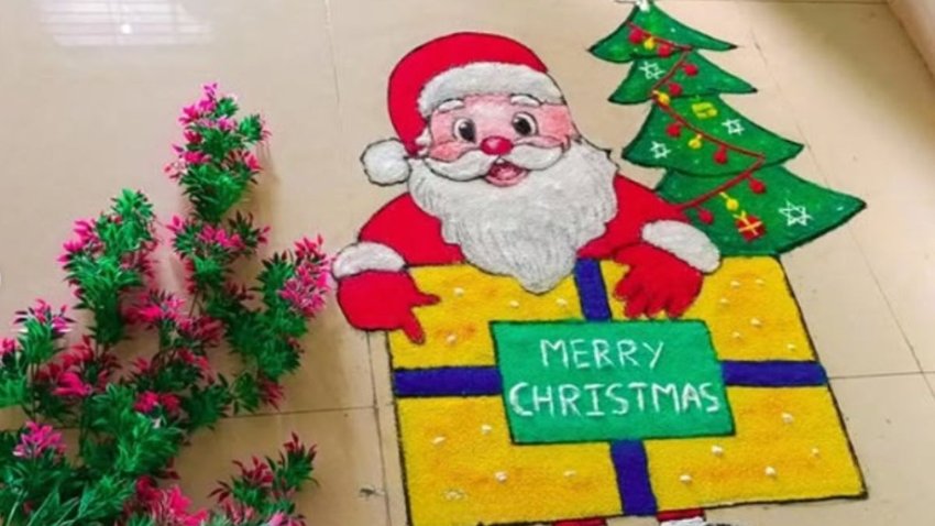 यह रंगोली काफी बेहतरीन लग रही है। इस रंगोली में सांता क्लॉस (Santa Claus) भी है, जो गिफ्ट लिए हुए है।