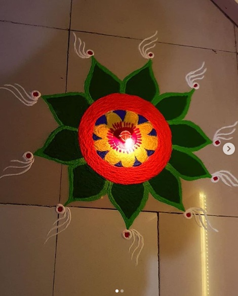 ये रंगोली बहुत ही सिंपल और देखने में काफी खूबसूरत लग रही है। इसके बीच में रखा दीपक इसकी खूबसूरती में चार चांद लगा रहा है।