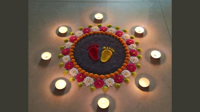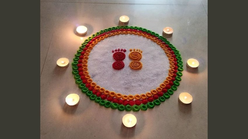 इन सब से अलग आप इस तरह मां लक्ष्मी के पैर वाले रंगोली डिजाइन भी बना सकते हैं। इस तरह की रंगोली भी आसानी से बन जाएगी।