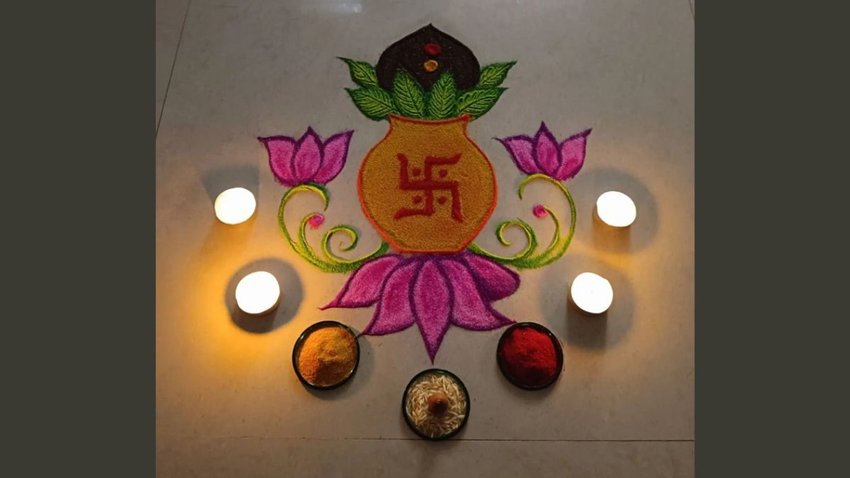 अगर आप पहली बार रंगोली बना रहे हैं, तो इस तरह कलश वाली रंगोली बना सकते हैं। ये रंगोली डिजाइन बेहद आसानी से बनकर तैयार हो जाएगा।