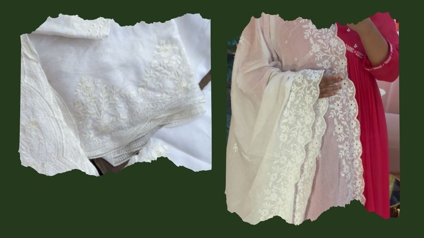 चिकनकारी लखनऊ की मशहूर हस्तकला है। यहां शेरवानी से लेकर कुर्ता और दुपट्टा इत्यादि पर चिकनकारी की जाती है। चिकनकारी दुपट्टे पर नाजुक और एकदम बारीक कढ़ाई की जाती है। इसकी डिजाइन महीन धागों के साथ की जाती है। पारंपरिक रूप से यह काम सफेद कपड़े पर सफेद धागे से किया जाता है। आप इस चिकनकारी दुपट्टे को सूट के साथ मैच कर सकती हैं।