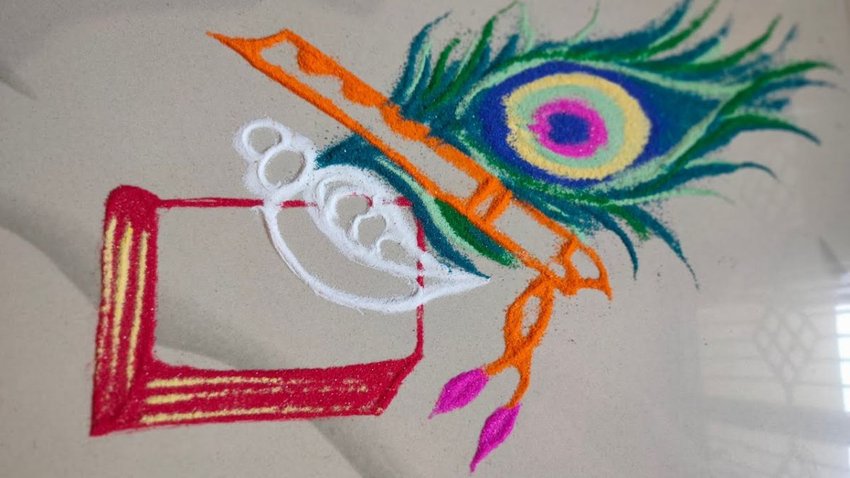 भगवान श्रीकृष्ण की पसंदीदा चीजों में शामिल शंख, बांसुरी और मोर के पंख को आप रंगोली का डिजाइन दे सकते हैं। यह रंगोली देखने में काफी खूबसूरत लग रहा है। आप इसको अपने घर के आंगन या फिर मेन गेट पर बनवा सकते हैं।