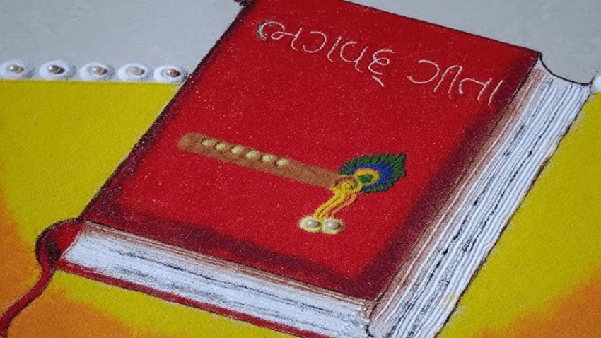 गीता जयंती के मौके पर आप श्री भागवत गीता के डिजाइन में रंगोली को बना सकते हैं। यह देखने में काफी यूनि लग रहा है।