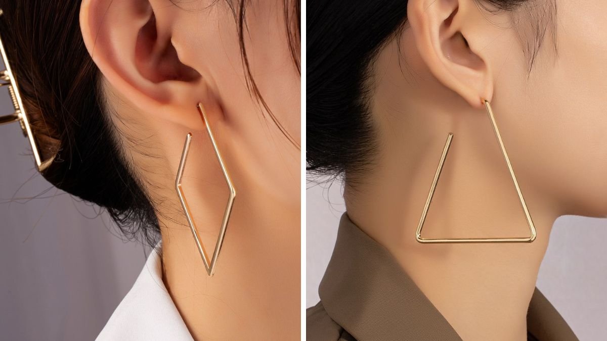 पतले फ्रेम वाले डायमंड शेप गोल्ड इयररिंग्स बेहद एलिगेंट दिखाई देते हैं। यह डिजाइन चेहरों को डिफाइन करता है और हर प्रकार के आउटफिट पर जंचता है। इसे ऑफिस, मीटिंग या किसी कैजुअल आउटिंग में आसानी से पहना जा सकता है।