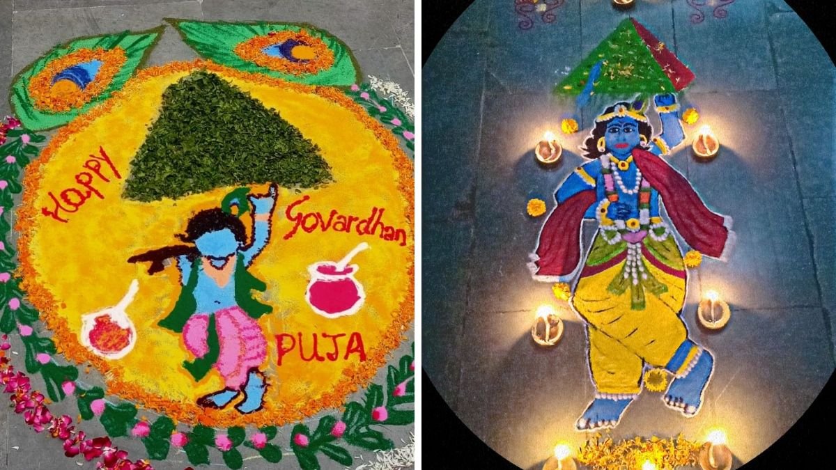 गोवर्धन पूजा के मौके पर आप इस रंगोली डिजाइन को आसानी से बना सकते हैं। इस रंगली डिजाइन में भगवान कृष्ण को गोवर्धन पर्वत उठाते हुए दिखाया गया है। रंग-बिरंगे फूलों और दीपकों से सजी यह रंगोली देखने में काफी खूबसूरत भी लग रही है।