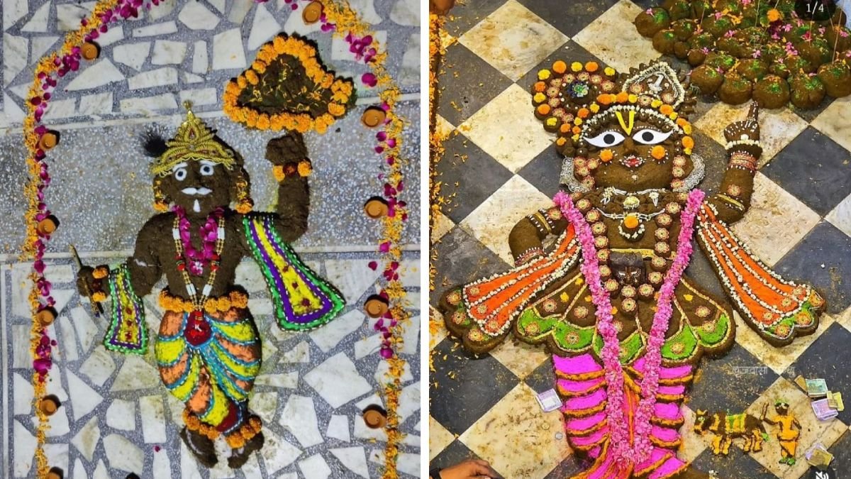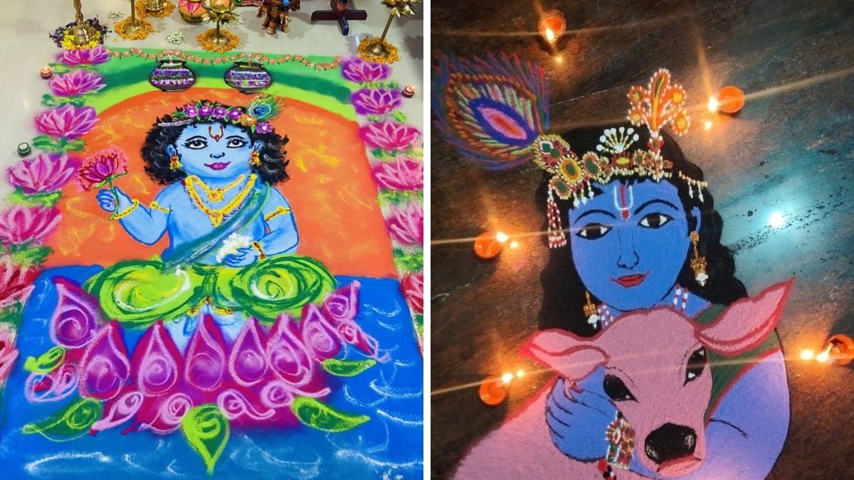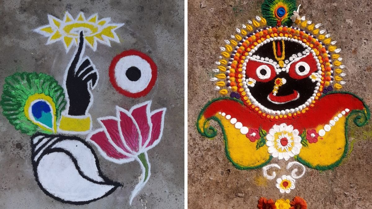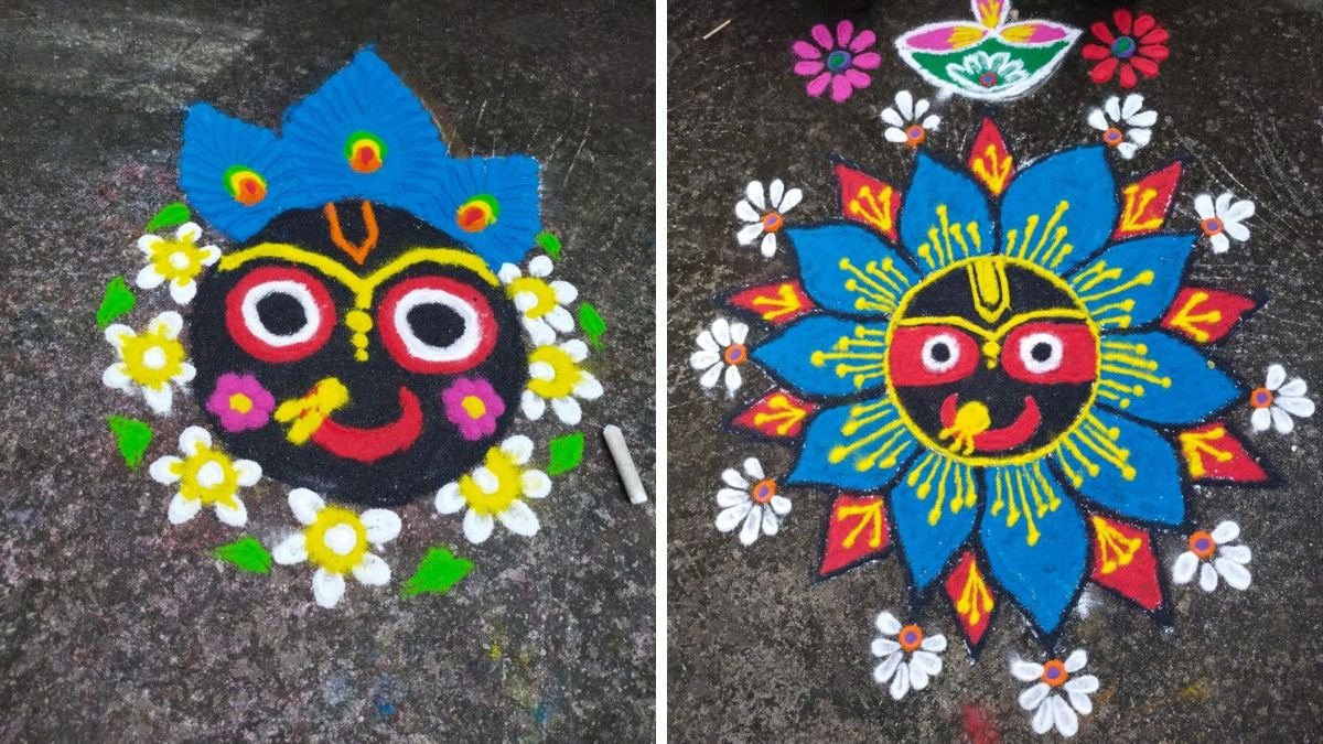 गोवर्धन पूजा पर आप इस रंगोली डिजाइन को भी अपने घर के मेन गेट या फिर बालकनी में बना सकते हैं। इस रंगोली डिजाइन में भगवान कृष्ण के हाथ में सुदर्शन चक्र और मोरपंख दिखाया गया है, जो शुभता और पवित्रता का प्रतीक है। वहीं, दूसरी रंगोली में भगवान जगन्नाथ की मनमोहक तस्वीर बनाई गई है। आप भी इसको आसानी से बना सकते हैं।