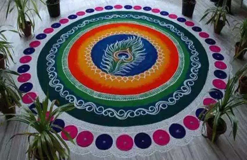 रंगोली को बनाने के लिए पहले तीन वृत्त यानी कि सर्कल बना लें। बीच वाले वृत्त में अपने इष्ट भगवान की आकृति बनाएं। दूसरे वृत्त में फूल तथा तीसरे वृत्त में छोटे-छोटे बॉक्स बना लें। हर बॉक्स में अलग-अलग रंग भर लें।