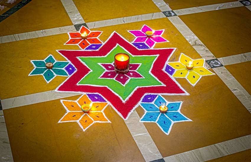 घरों के प्रवेश द्वारों को खूबसूरत रंगों और कलाकृतियों से सजाया जाता है। हिंदू परंपरा के हर त्यौहार बिना रंगोली के अधूरे हैं लेकिन दिवाली के दौरान रंगोली का विशेष महत्व होता है। रंगोली को बिना दिवाली अधूरी मानी जाती है।