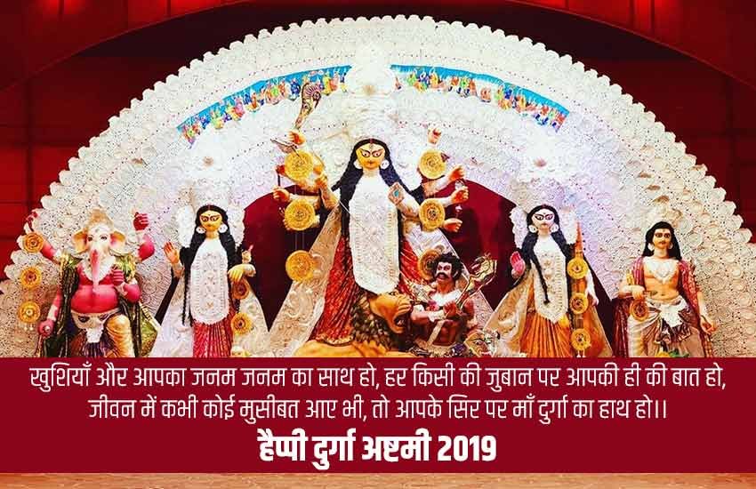 Happy Durga Ashtami 2019 Wishes Images, Photos, Pics, Quotes, Wallpaper: नवरात्रि के आठवें दिन को दुर्गा अष्टमी या महा अष्टमी कहा जाता है। नौ दिनों के इस व्रत में अष्टमी के दिन कन्या पूजन से लेकर व्रत इत्यादि का खास महत्व होता है। इससे एक दिन पहले ही मूतियों को पंडाल में स्थापित कर विधि विधान से पूजा शुरू हो जाती है। पूरे उत्तर भारत में दुर्गा पूजा का उत्सव न सिर्फ घर घर में मनाई जाती है बल्कि तमाम सांस्कृतिक कार्यक्रमों के साथ भी इस उत्सव को कई गुना उत्साह के साथ मनाया जाता है। आइए मां दुर्गा के आशीष को घर घर अपने दोस्तों परिवारों और समाज के हर वर्ग तक पहुंचाते हैं…