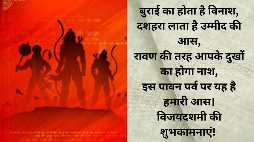दशहरा के दिन रावण का पुतला बनाकर उसका दहन भी किया जाता है। इस मौके पर लोग एक दूसरे को शुभकामना देते हैं। हम इस लेख में आपके लिए कुछ शुभकामना संदेश लेकर आए हैं, जिसको आप अपने परिवार और सगे संबंधियों को भेज सकते हैं।