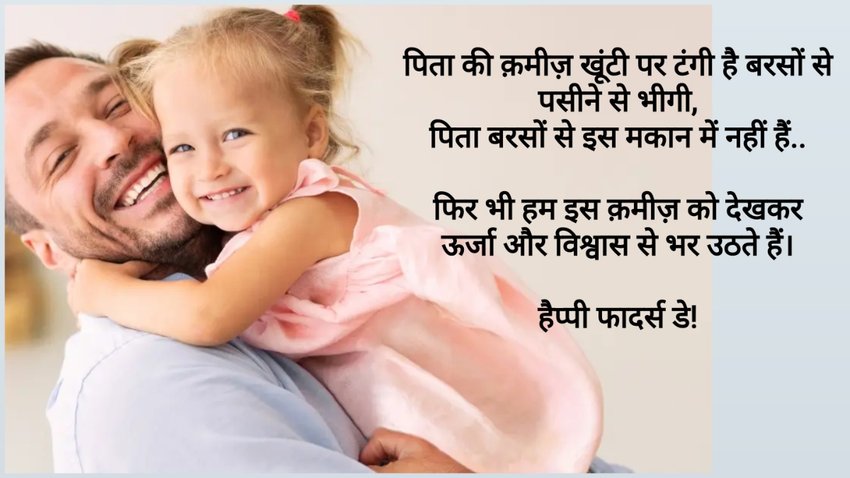 Happy Father’s Day 2024 Wishes Hindi Shayari, Images, Messages: हम सबके लिए पापा एक ऐसे इंसान हैं जिनसे बात करना कभी भी उतना आसान नहीं होता है। ऐसे में फादर्स डे पर आप अपने मन की बातों को कुछ खास संदेशों के साथ व्यक्त कर सकते हैं। यहां हम आपके लिए कुछ ऐसे ही संदेश लेकर आए हैं। इन संदेशों में ये मैसेज छिपा है कि पिता हमारे लिए क्या- क्या करते रहे हैं। पूरा जीवन उन्होंने हम पर लगा दिया है और वो हमेशा हमारे हीरो रहेंगे। तो आइए जानते है ऐसी ही भावनाओं से भरे इन संदेशों को जो कि आपके पापा के दिल तो छू सकता है।