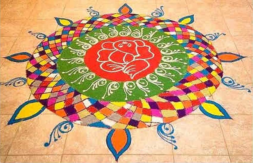 रंगोली आटा, चावल, हल्दी, कुमकुम, फूल-पत्तियों या अनेक प्रकार के रंगों से अलग-अलग डिजाइन में बनाई जाती है।