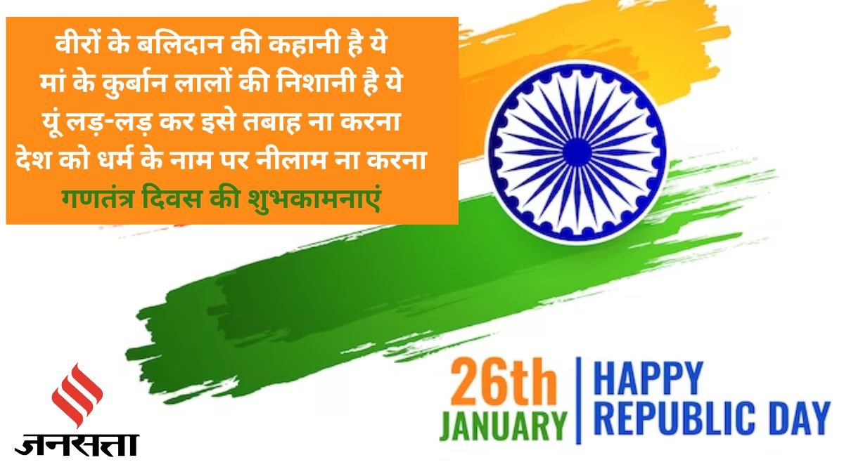 गणतंत्र दिवस उस दिन की याद दिलाता है जब भारत का संविधान 26 जनवरी, 1950 को लागू हुआ था। इसे 26 नवंबर, 1949 को संविधान सभा द्वारा बनाया और अपनाया गया था। हमें गर्व होना चाहिए कि हम भारतीय हैं। हम उस देश के वासी है जिस देश में सब धर्मों को सम्मान दिया जाता है, किसी के साथ भेदभाव नहीं होता। हम उस देश में रहते है जिसका संविधान पुख़्ता है, जो किसी धर्म के साथ अन्याय नहीं होने देता। आप भी गणतंत्र दिवस के इस मौक़े पर गर्व और सम्मान महसूस करते हैं और इस दिन अपने दोस्तों और साथियों को बधाई संदेश देना चाहते हैं तो इन खूबसूरत और देश भक्ति के मैसेज को शेयर करें।