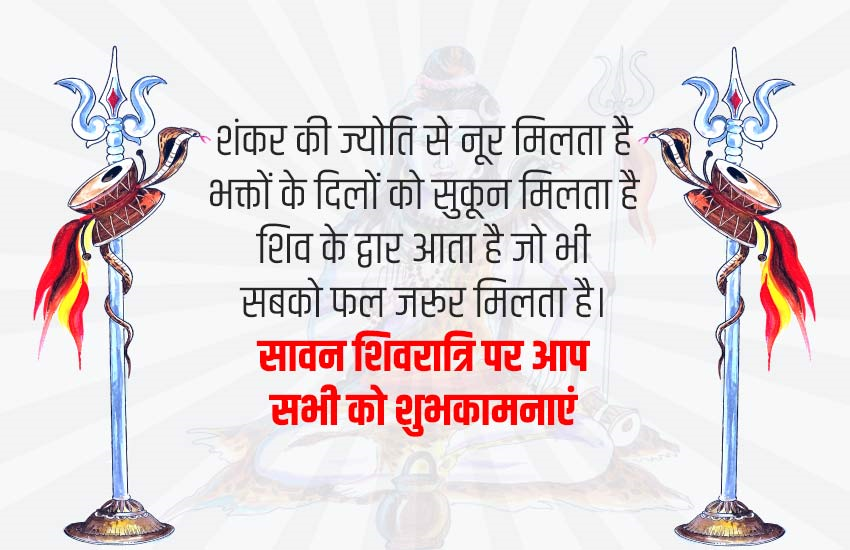 सावन की शिवरात्रि को फाल्गुन महीने में आने वाली महाशिवरात्रि के समान ही फलदायी माना गया है। बता दें कि इस बार सावन की शुरुआत और समाप्ति दोनों ही सोमवार को होगी। इस बार सावन में कुल पांच सोमवार का दिन रहेगा। शिवरात्रि के इस खास मौके पर आप अपने दोस्तों और रिश्तेदारों को सोशल मीडिया के जरिए इन कोट्स, इमेजेज को भेजकर शुभकामनाएं दें।
