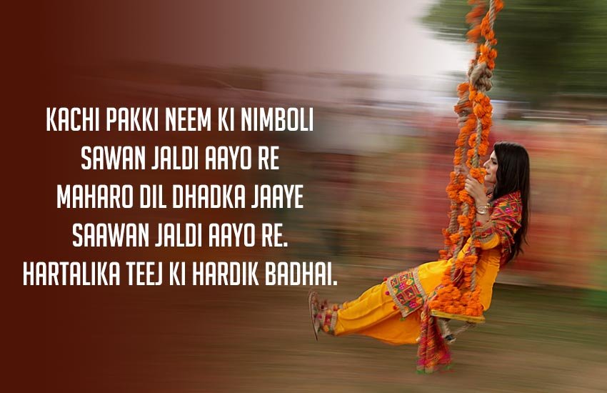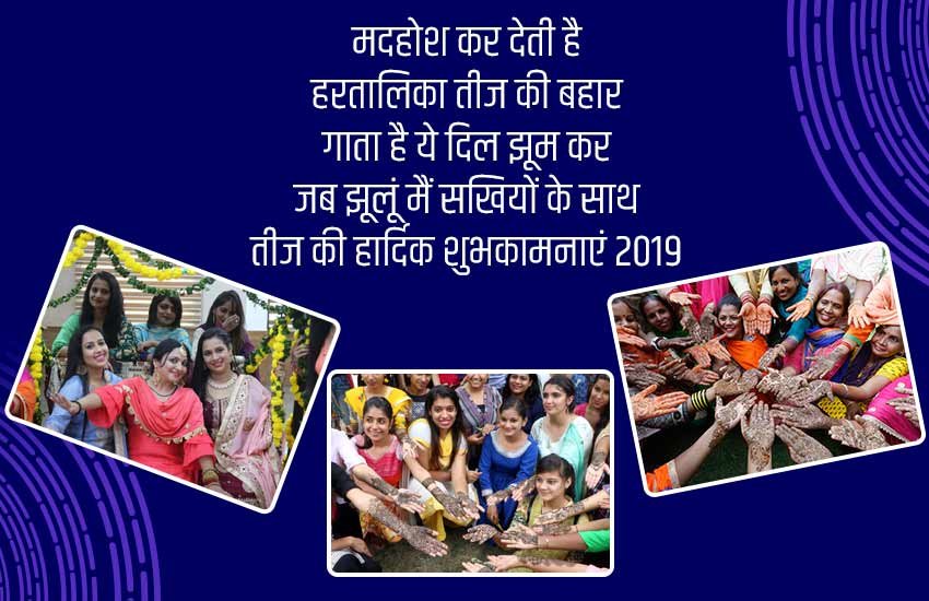 तीज का त्यौहार है मधुर प्यार का, दिल की श्रद्धा और सच्चे विश्वास का, बिछिया पेरों में हो माथे पर हो बिंदिया, हर जनम में मिले हमें ऐसा पिया।। हरतालिका तीज की बधाई