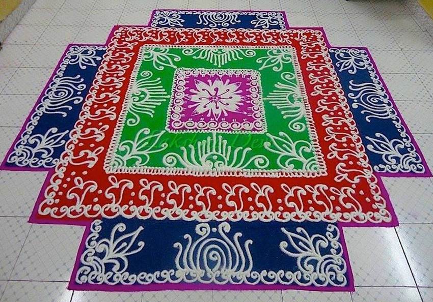 कॉर्नर वाली रंगोली डिजाइन: अक्सर रंगोली प्रवेश द्वार पर बनाई जाती है, लेकिन इस तरह की रंगोली घर के कोनों में बनाई जा सकती है। जो आपके घर के कोने-कोने को आकर्षक बना देगी।